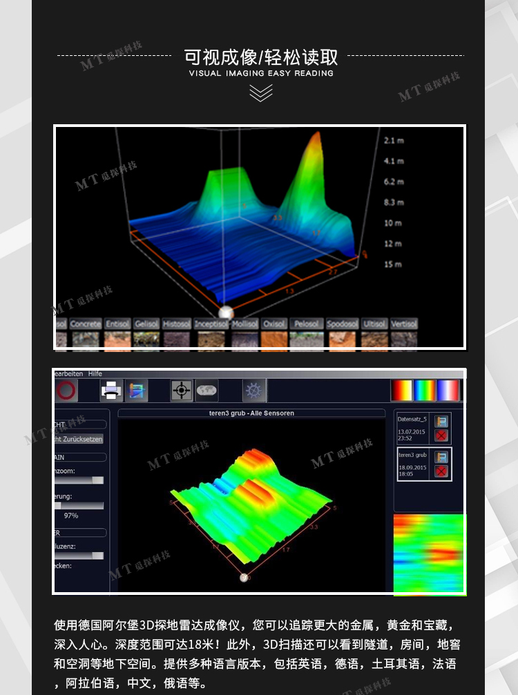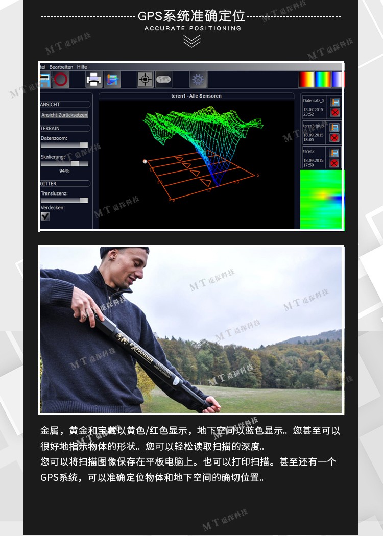 使用德國(guó)3D探地成像系統(tǒng),您可以追蹤大的金屬,黃金和寶藏。深度可達(dá)18米。此外,3D掃描還可以看到隧道,房間,地窖和地下空洞等。