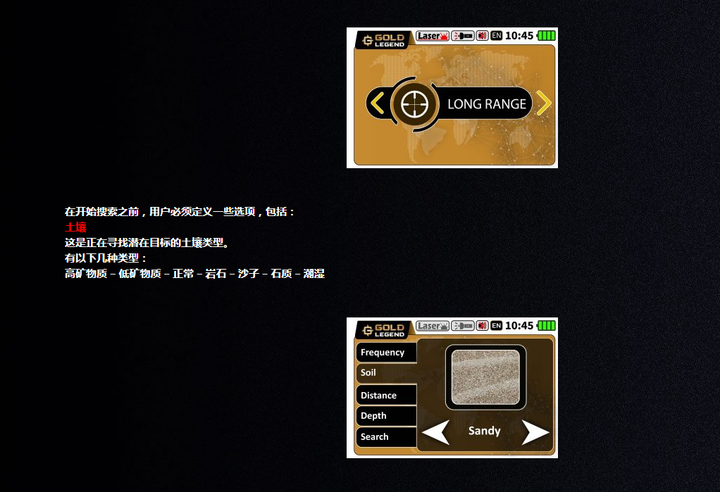 黃金傳奇特點(diǎn) 5 搜索系統(tǒng) Gold Legend 金屬探測器設(shè)備包括五個(gè)不同的集成搜索系統(tǒng),為用戶提供了一種簡單的方法來檢測地下埋藏目標(biāo)、了解其確切位置并估計(jì)其所在深度。 該設(shè)備中包含的五個(gè)搜索系統(tǒng)包括: 1 – 遠(yuǎn)程系統(tǒng) 2 – 自由模式系統(tǒng) 3 – 智能深度系統(tǒng) 4 – 離子系統(tǒng) 5 – 仿生系統(tǒng) 可以從主菜單輕松選擇搜索系統(tǒng),以下是每個(gè)系統(tǒng)的詳細(xì)選項(xiàng)。 1 – 遠(yuǎn)程系統(tǒng) 遠(yuǎn)程搜索系統(tǒng)采用技術(shù)開發(fā),可確保遠(yuǎn)距離探測深層金屬物體和埋藏寶藏,并提供土壤、目標(biāo)類型和距離范圍等定制搜索選項(xiàng),以獲得可靠的正確結(jié)果。 Gold Legend中的遠(yuǎn)程系統(tǒng)工作原理取決于產(chǎn)生無線電頻率并通過安裝在主機(jī)前面的兩個(gè)天線發(fā)送和發(fā)送它們,當(dāng)設(shè)備產(chǎn)生的無線電頻率擊中潛在目標(biāo)時(shí),設(shè)備開始向目標(biāo)旋轉(zhuǎn)手柄周圍。